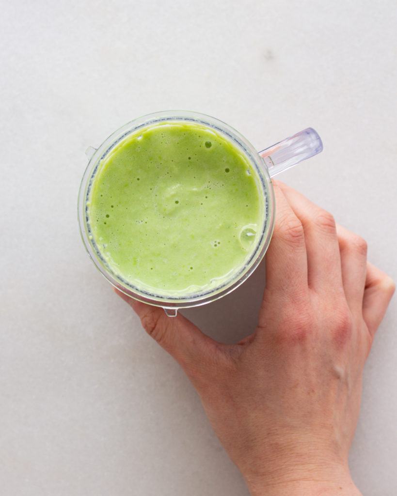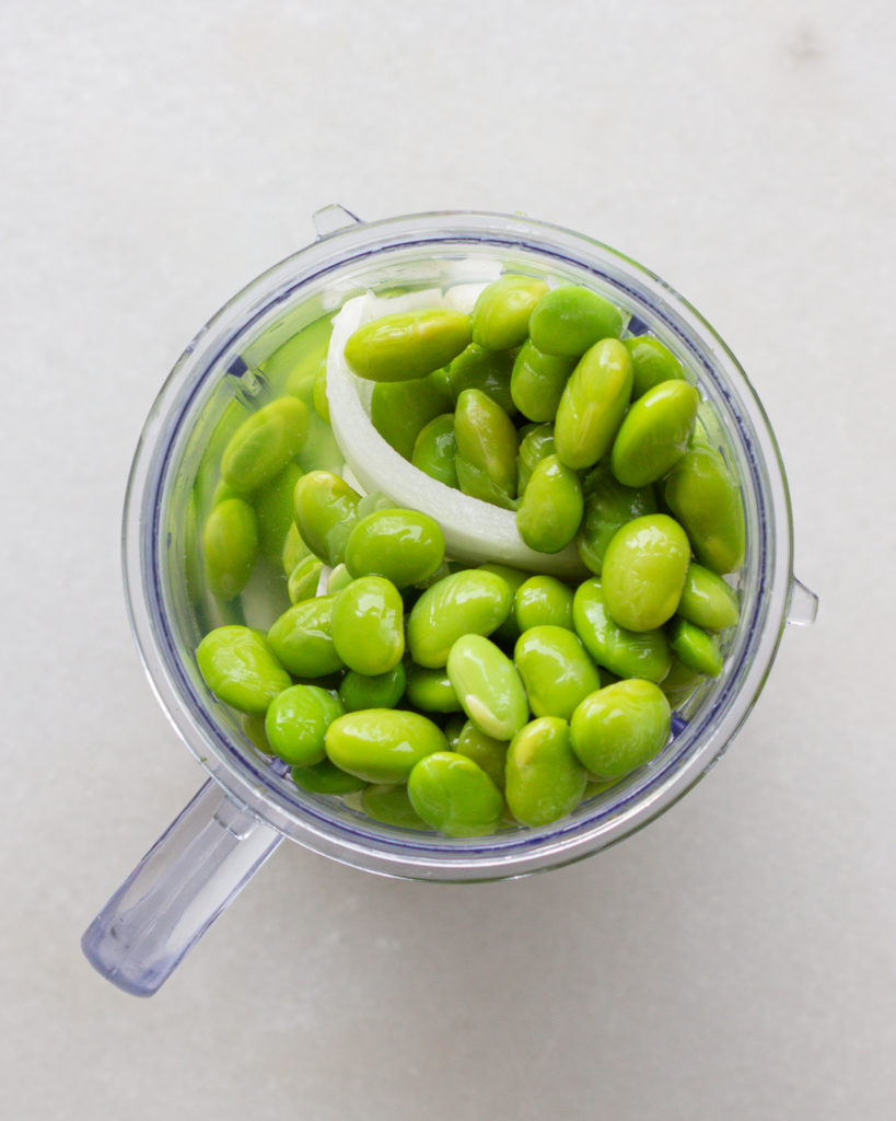 - Add the edamame, jalapeño, onion, garlic and water to a small blender. Blend until completely smooth.