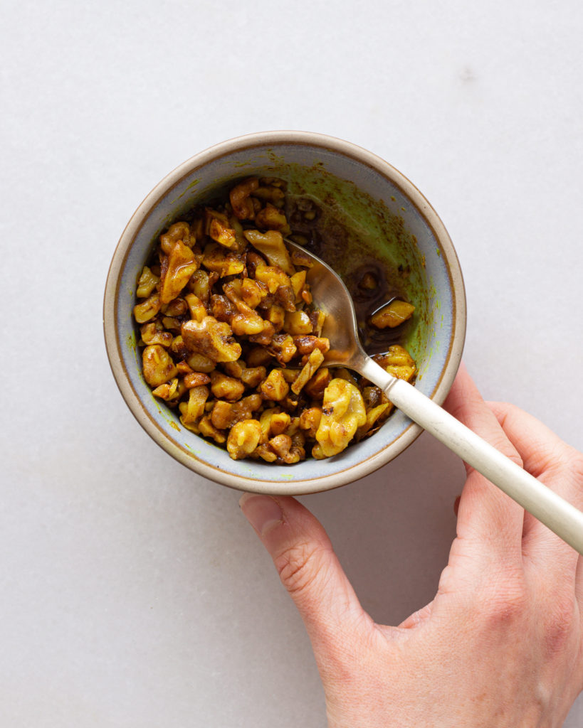 First make the turmeric lime walnuts: