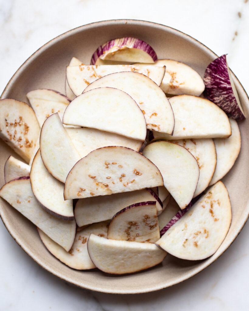 - Remove the eggplant from the pan and set the pieces aside.