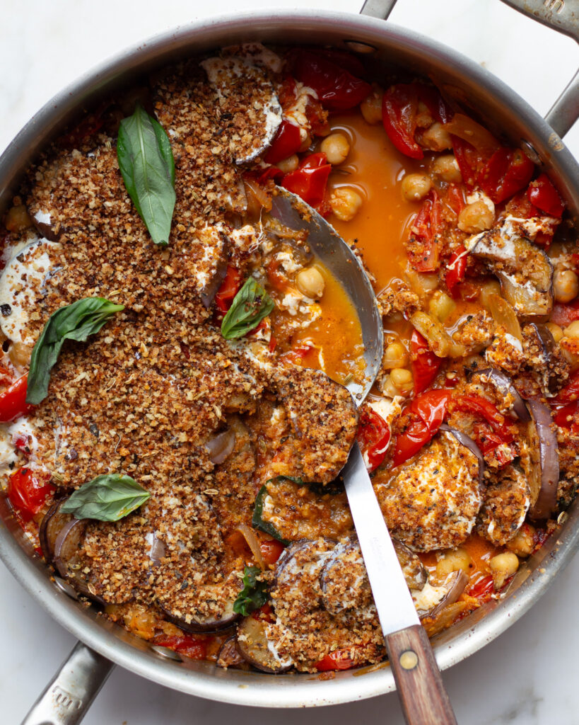 How this eggplant parmesan chickpea stew happens all in one pan