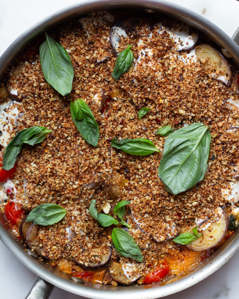 Absolutely LOVE! Such a clever combination of flavors. Have all your ingredients prepped and ready to go, and the recipe comes together quickly (and we love a one pan wonder). It was REALLY spicy for us with 2 tablespoons of the Calabrian peppers, so when we make again (which will be sooooon because YUM) we’ll opt for just 1 tablespoon. We also didn’t use but maybe 1/2 cup or less of breadcrumbs and it was the perfect amount! Lastly, don’t skimp on the oil when frying the eggplant as they really do absorb it!