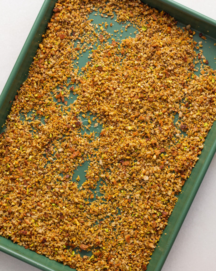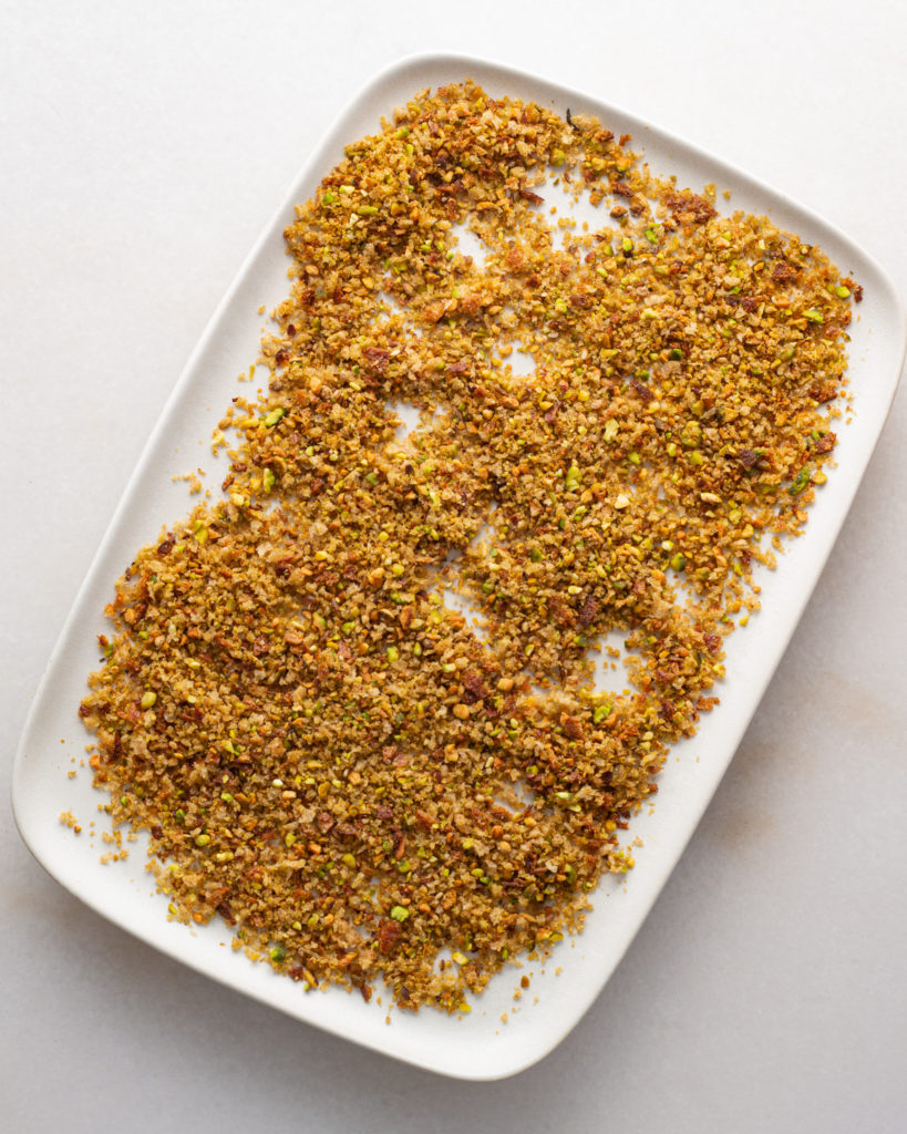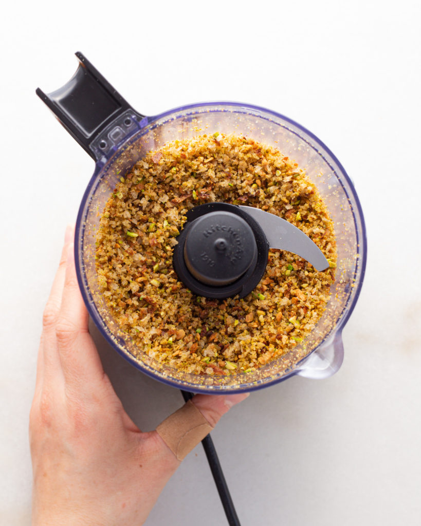 - Set your oven to 350F. In a food processor, pulse together the pistachios and bread until you get fine crumbs. Spread these on a baking sheet and toast until crispy, about 5-6 minutes.