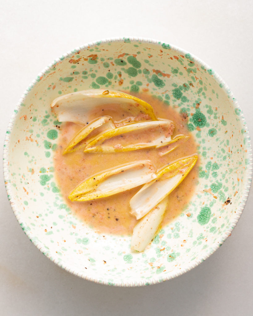 - Add the endive leaves to the bowl and toss to fully coat them.