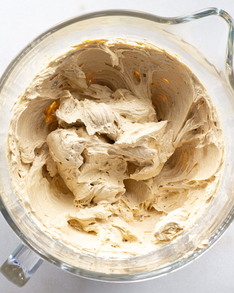 - Add the sugars to the stand mixer and mix on medium to create a gravely mixture. Add in the mostly cooled brown butter and beat until smooth and fluffy, about 3-4 minutes on medium. Add the vanilla and eggs and beat on medium high until the dough is very fluffy and smooth, about 2-3 minutes more.