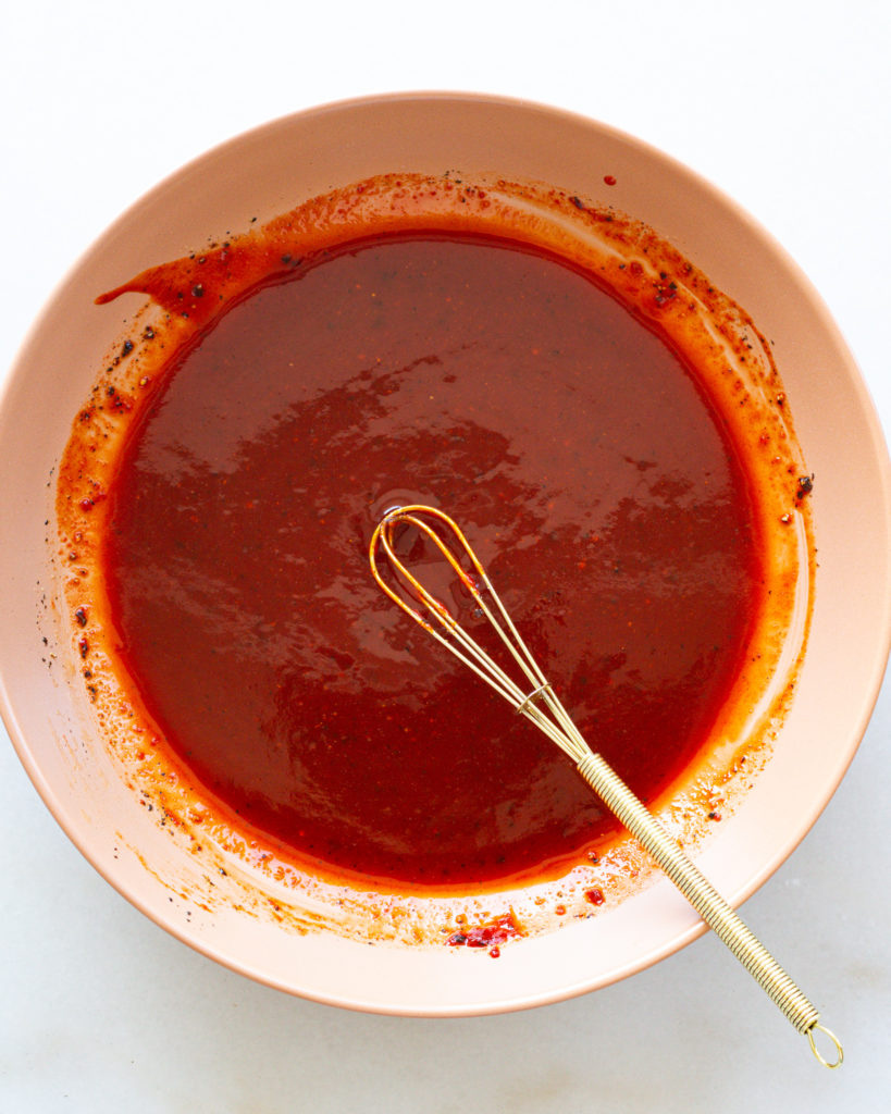 - In a large bowl, add the gochujang, maple syrup and rice vinegar. Whisk to combine, then add a few cracks of black pepper to taste.