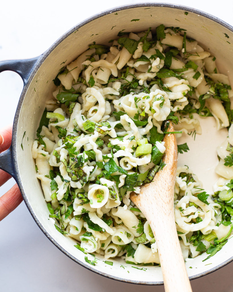 - Add in the chopped herbs. Stir well. You want the pasta to still be warm so that the herbs wilt slightly.