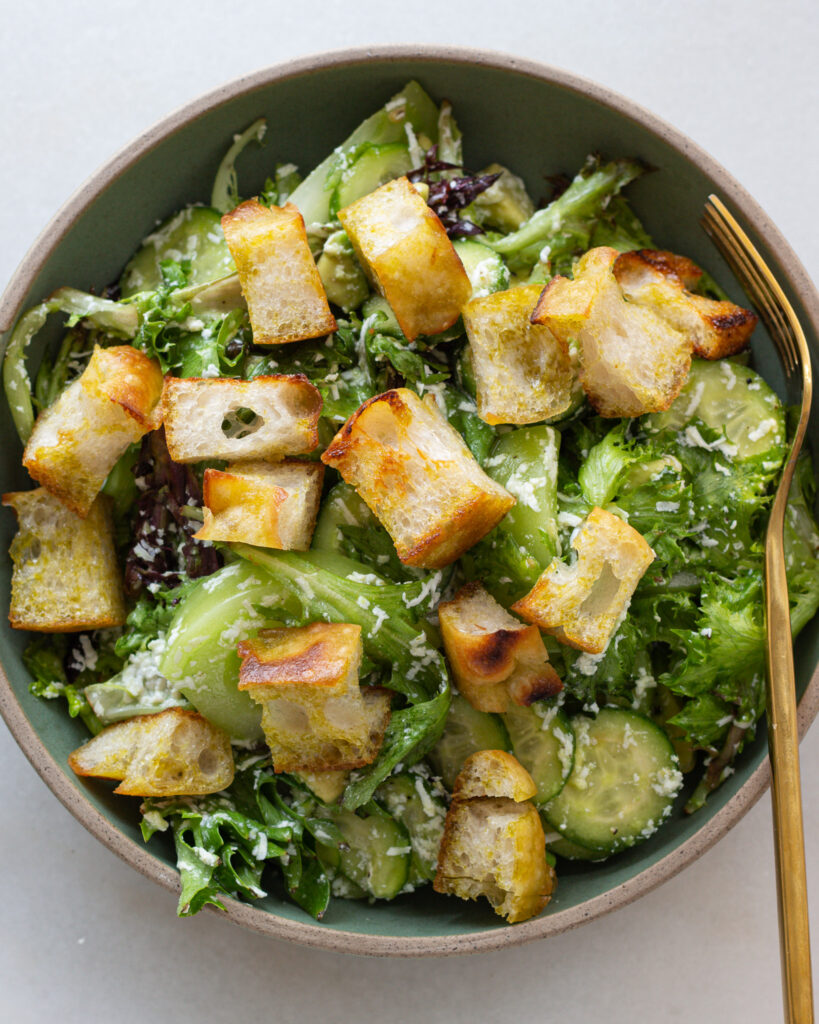 The only cooking in this salad is the croutons – after that it’s a really quick assemble, almost too quick that it feels like you aren’t really cooking, but sometimes that’s the point, no?