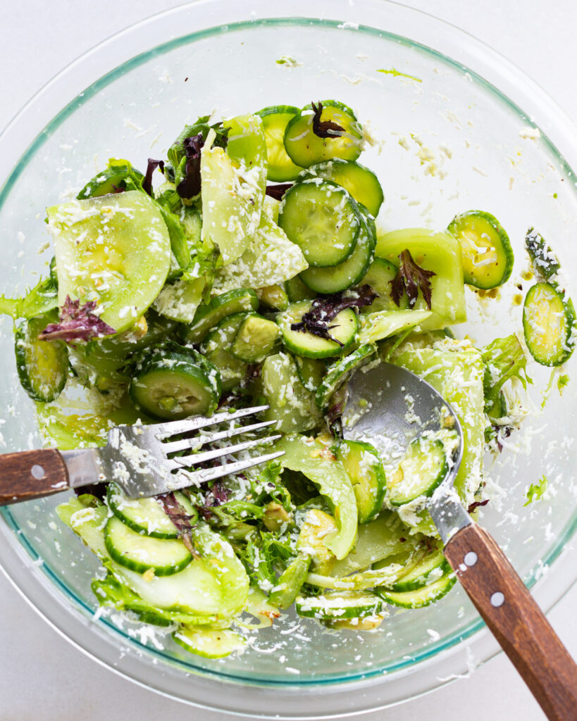 The green tomatoes are the star of this recipe, and I use their vegetal, crisp flavor to play off of the white wine vinegar dressing. The dressing is so acidic that it almost quickly pickles the tomatoes, mellowing them out in a way that makes them ready to be eaten in green tomato salad form. The other ingredients are just a love letter to vegetable-forward salads, with cucumbers for their sweetness, a slightly underripe avocado for its richness and bite, and my favorite kind of lettuce to round everything out.