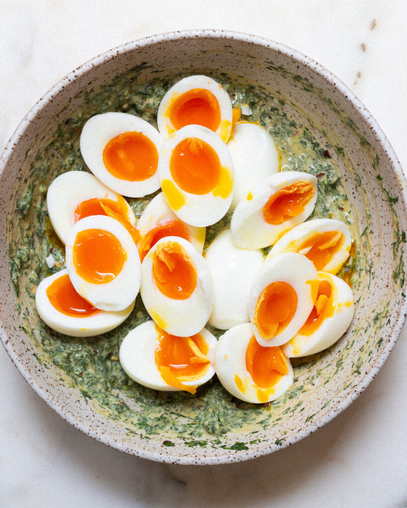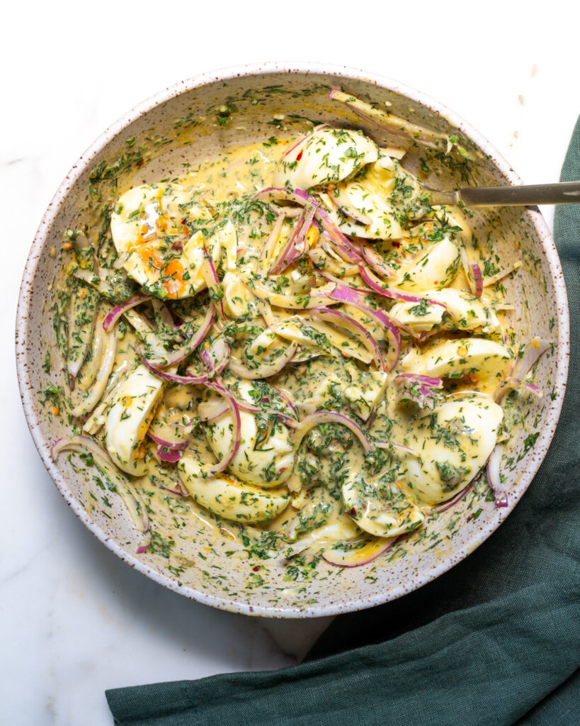 - Peel and halve the eggs. Add them directly into the bowl with the dressing. Gently mix so that the dressing coats the eggs.