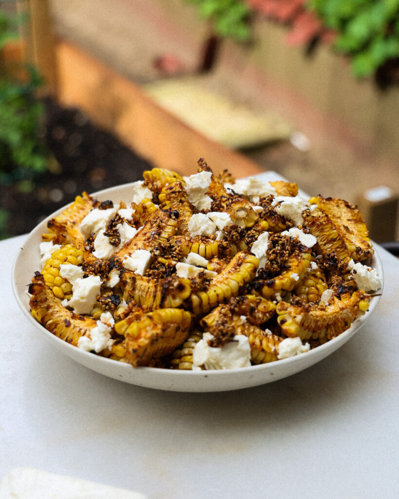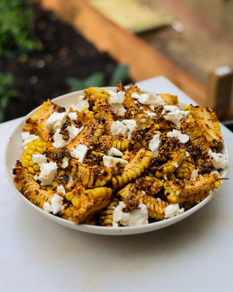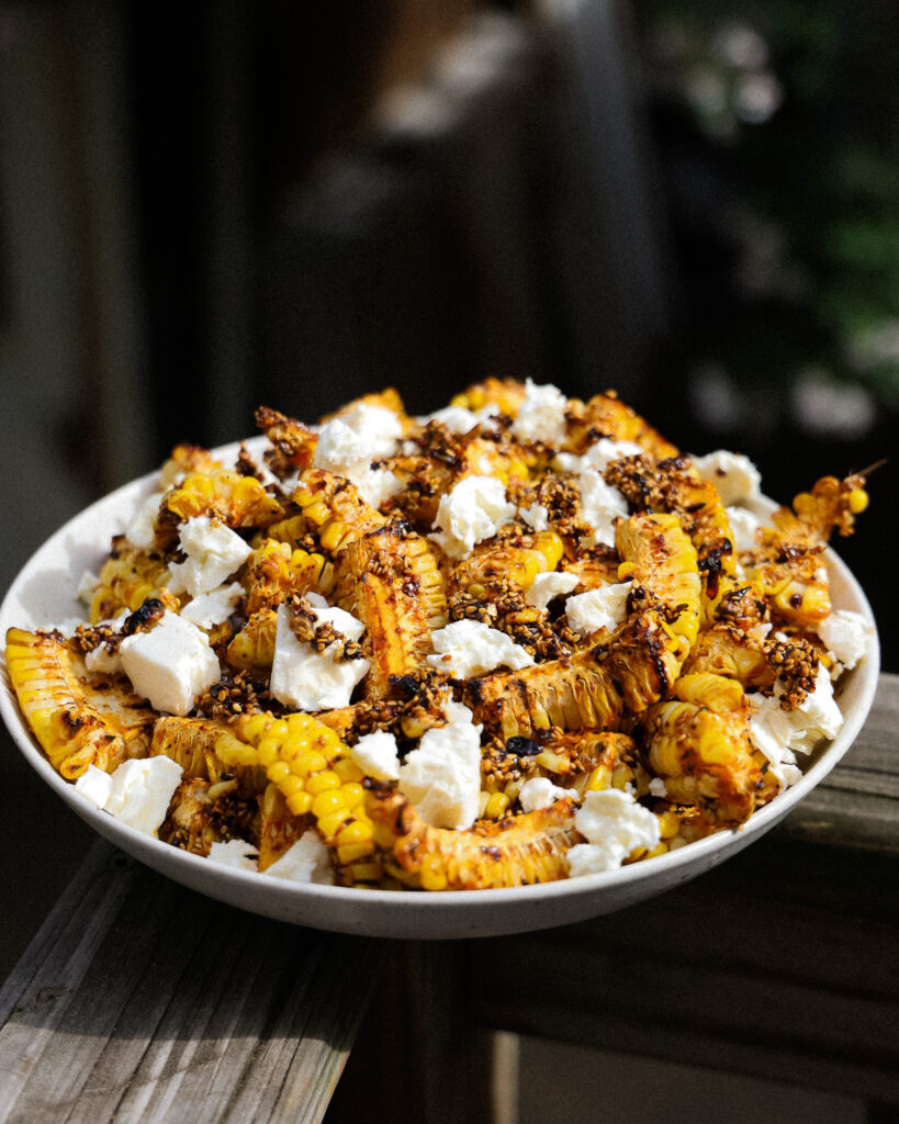 If you’re looking for the it side dish of the summer, this is it. This Grilled Corn with Sesame Hot Honey & Feta is smoky, spicy, sticky, and salty—all the best textures and flavors for when you’re building a table full of vibrant summer food. Whether you serve the corn whole, shaved off the cob, or cut into crispy little “ribs,” the hot honey glaze and perfectly salty feta make it an absolute hit every time.