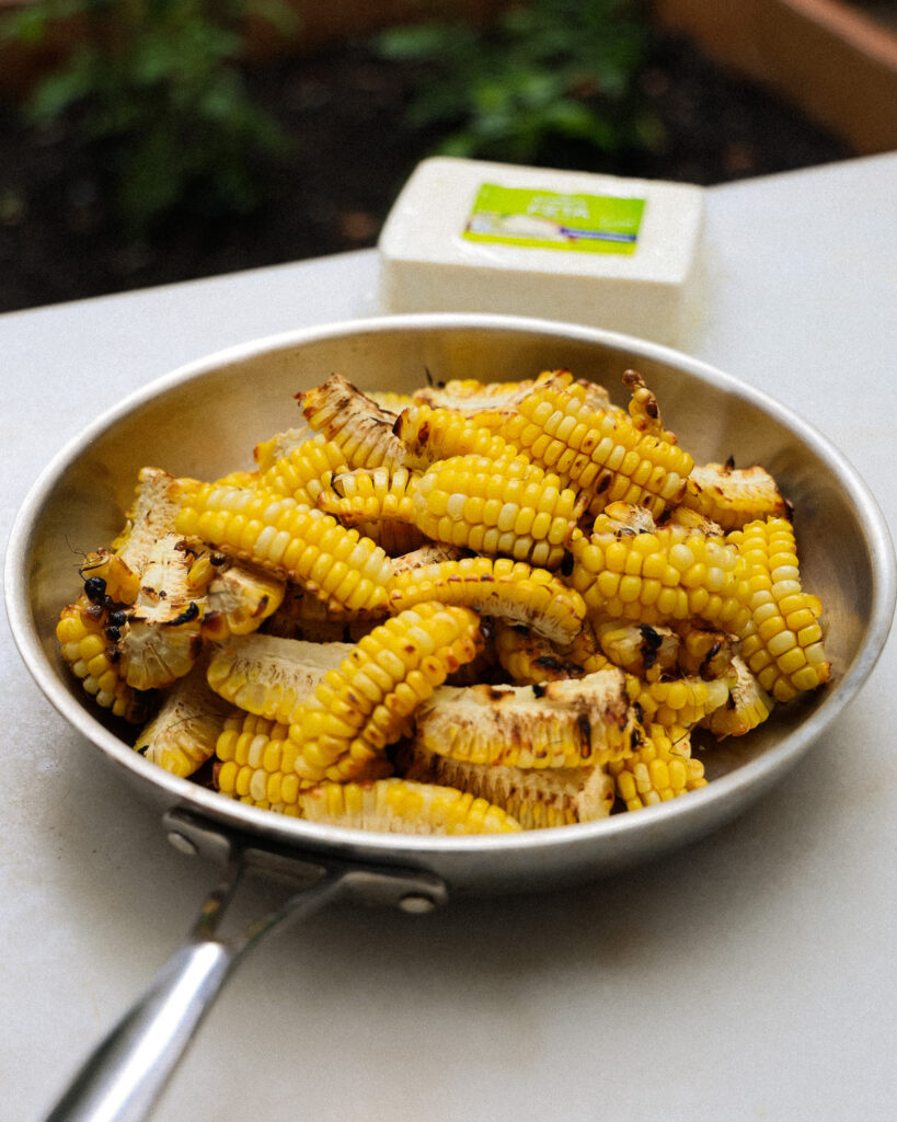 For the easiest way to serve this, cut all the kernels off the corn cobs and cook them in the pan, stirring occasionally. You can also do this in a cast iron pan on a grill.