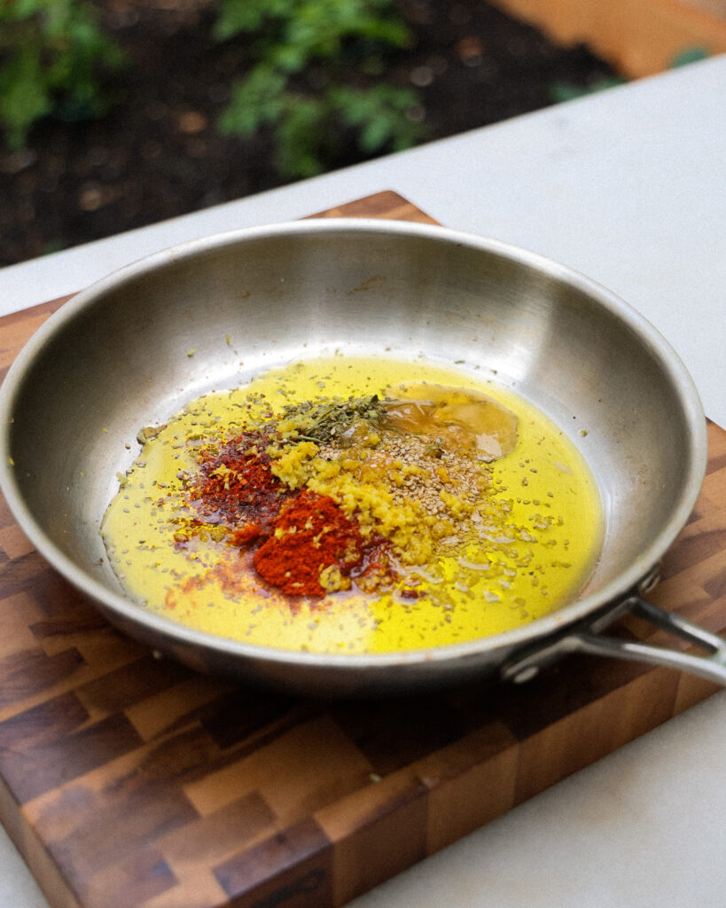 - To a medium sauté pan, add the 1/4 cup of sesame seeds, 1 teaspoon of Aleppo pepper, 1 teaspoon dried oregano, 1 teaspoon smoked paprika, and 1 teaspoon lemon zest. Pour over 1/4 cup of olive oil and swirl.
