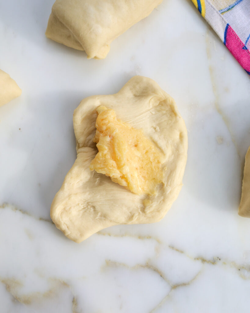 - Use a bench scraper to cut the dough into eight pieces. Pull and flatten them out widely with your hands, then put a scant tablespoon of the honey butter in the center of each piece. Working around the edges of the dough, fold the edges over to seal in the honey butter.