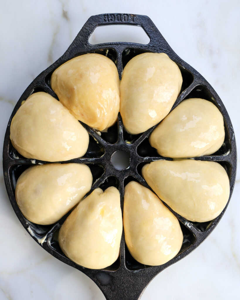 - Grease a 10-inch skillet or a 9-by-9-inch baking pan with butter. Place the dough balls seam-side down in the pan. Cover and let them proof another hour until they have grown another third in size.