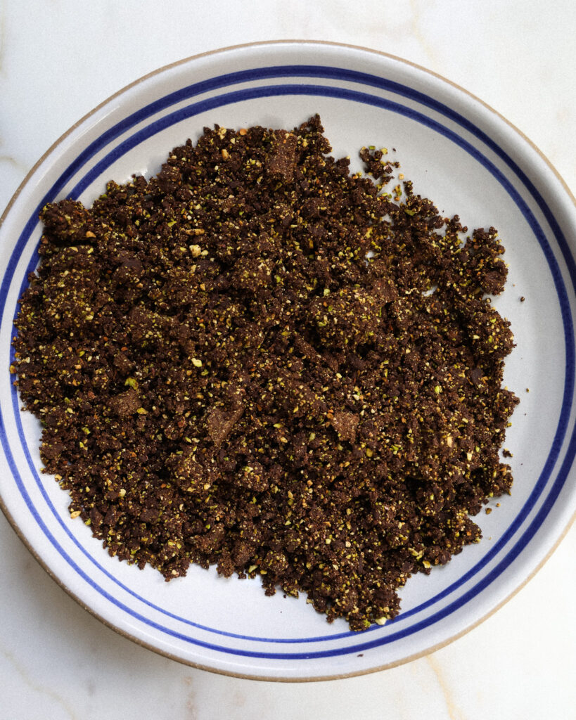 - A pistachio-chocolate crumble that melts into little pools of nuttiness and richness. It’s just the right amount of chocolate, IMO.