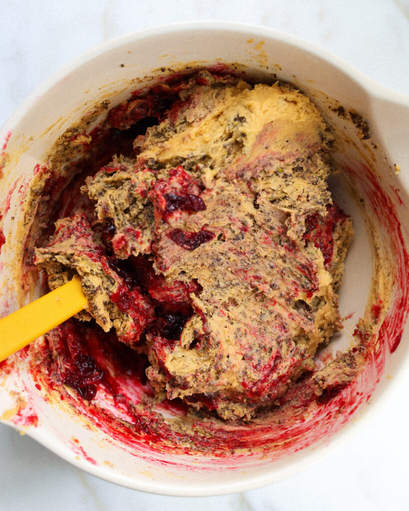 The cranberry sauce can be easily overmixed into this dough, but don’t stress it! I recommend folding the cranberry sauce in in 4-5 big folds, so that it is evenly distributed but still looks like a ribbon throughout the cookie.