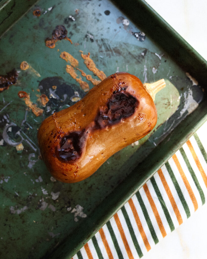 - Pierce the honeynut squash a few times with a knife, then add it to a baking sheet and roast for 30-40 minutes at 400°F, or until soft. If you are using canned purée, skip this step.