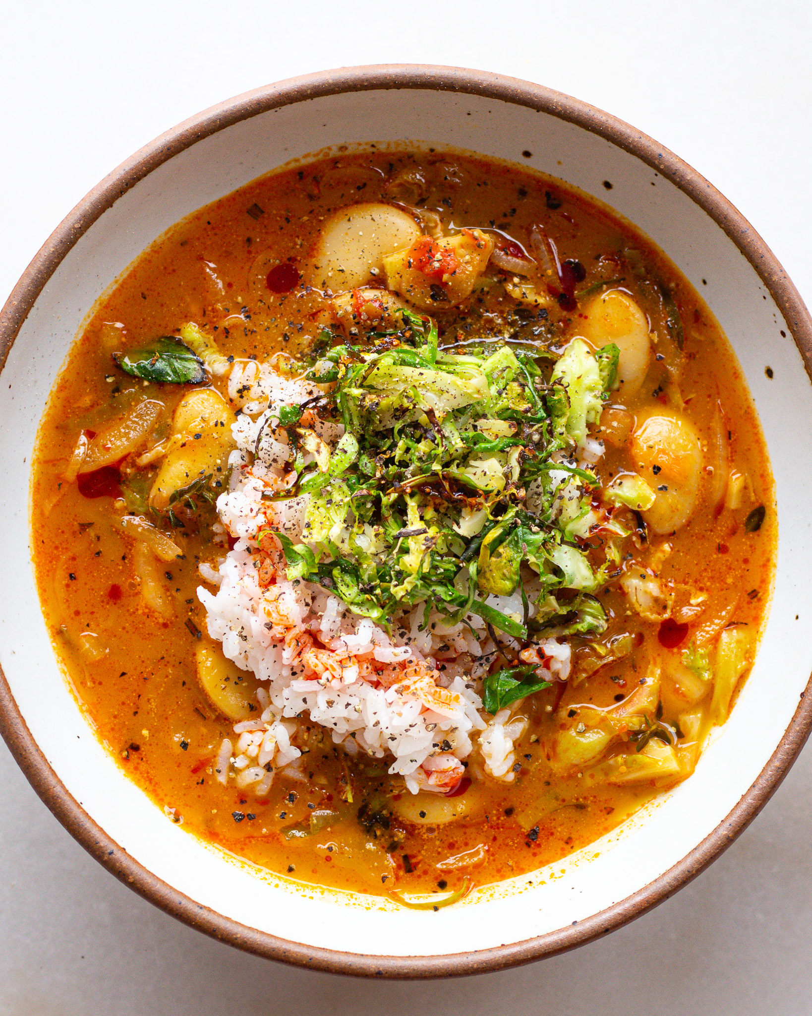 - To serve, generously portion into 4 bowls, top with the charred brussel sprout shred and eat with either crusty bread or warm rice.