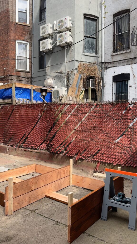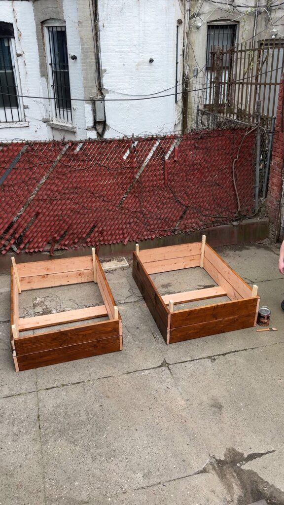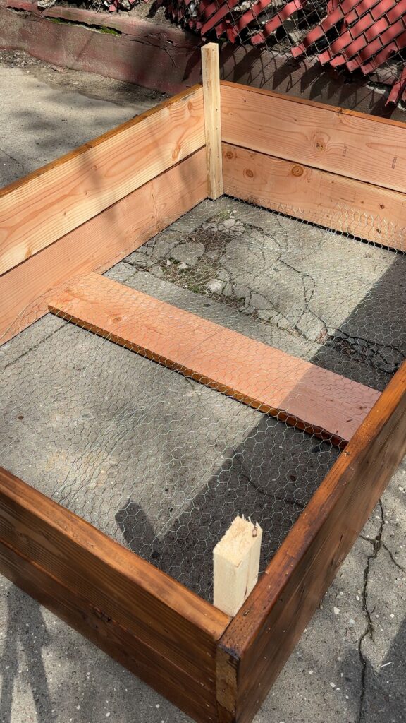 For a wood garden bed, drainage and stability are crucial. The reason we attach the 2x2s to the 6-foot plank is so that the interior of the garden beds is 4-feet even. This means you can slot in a 4-foot plank across the center to help stabilize the beds and relieve any pressure from the soil.