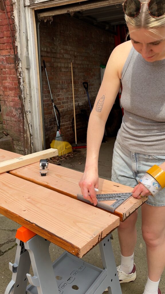 Adhere the 2x2s on either side of the 6-foot plank, making sure to mark in two inches each time.