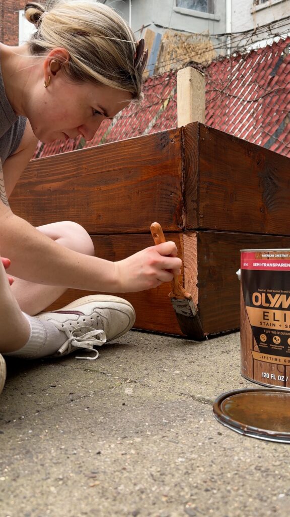 The stain I chose is Olympic’s Semi-Transparent Exterior Wood Stain + Sealer in Chestnut Brown. It’s good to look for both a stain and sealer so you can ensure the exterior of your wood is protected. I like the look of semi-transparent best, since it lets the natural grain of the wood show through.