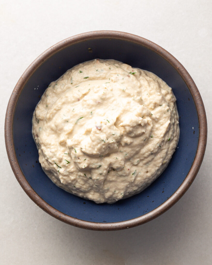- In a food processor, add the tuna (drain any excess oil from the can), the anchovies, the dill, garlic, red pepper flakes and 1/2 tsp of salt. Squeeze in the juice from the lemon. Pour in the cashew cream and pulse until the tuna is smooth and almost "whipped."