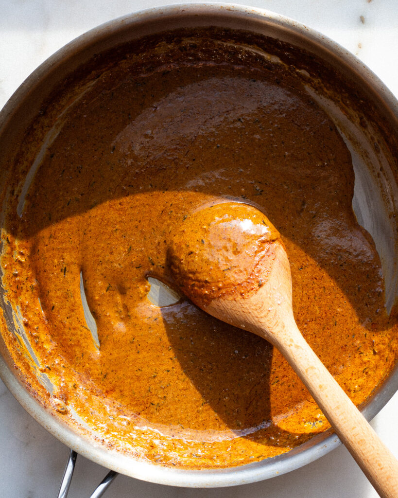- Allow the butter to melt, stirring constantly to let the spices begin to sizzle and darken.
