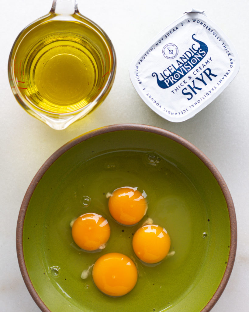 Add the yogurt, oil and eggs directly to the large bowl. Whisk vigorously to combine. When it is smooth, switch to a spatula.