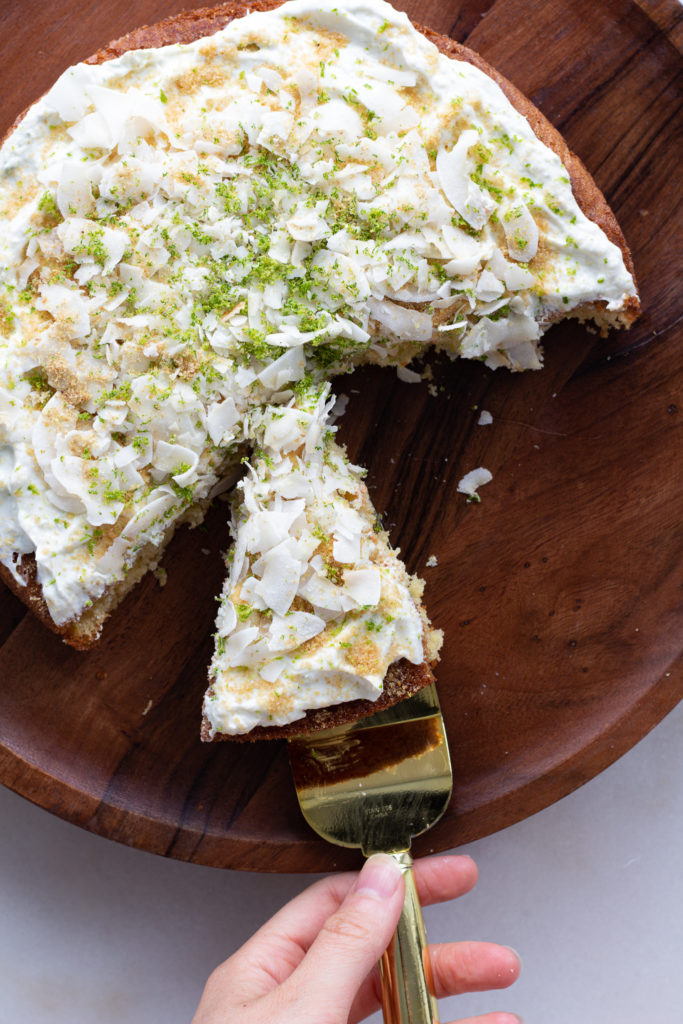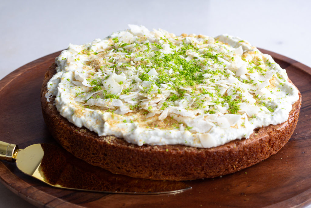 - Use a serrated knife to cut any doming off the cake, then flip it over and remove the parchment paper. Ice the cake with the lime yogurt, and top with coconut, flax seed, and extra lime zest. Slice & serve!