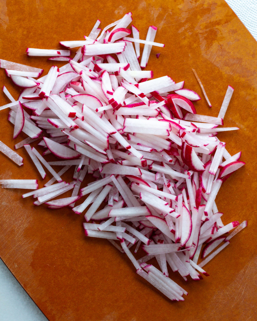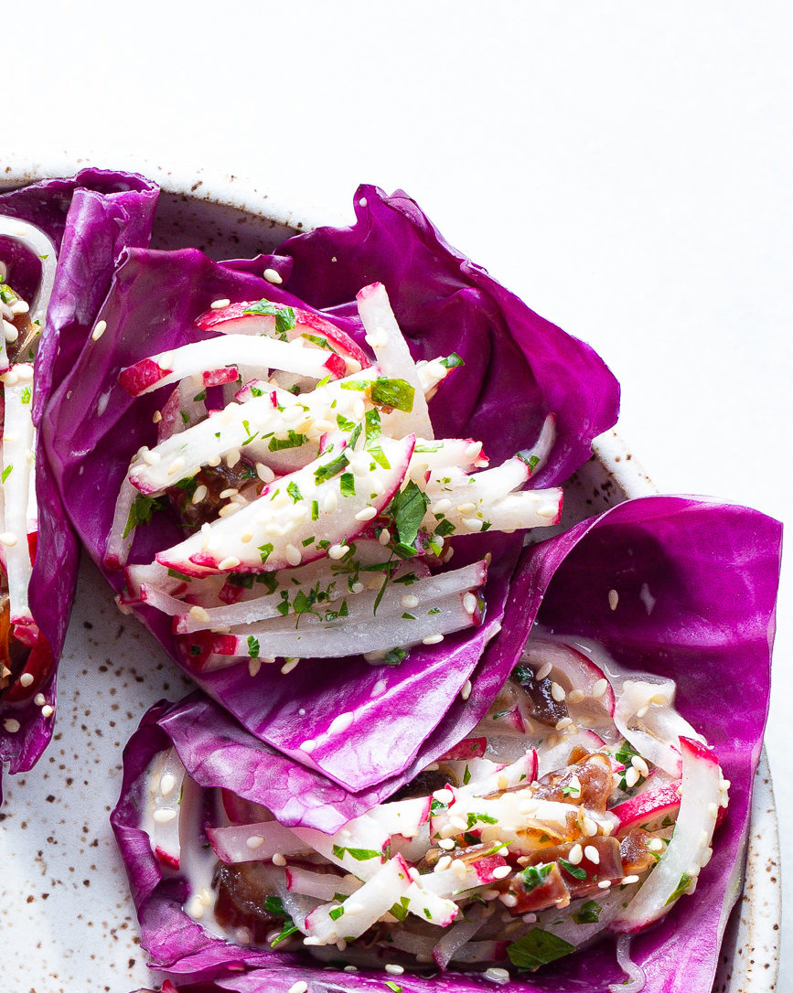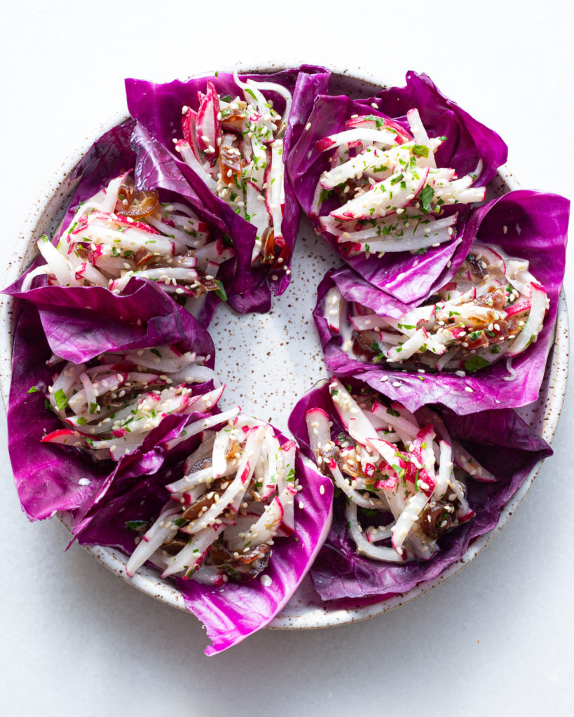 - Cut the red cabbage leaves into pieces that can form tiny cups, portion the radish salads into each cup, almost like you are making a small taco.