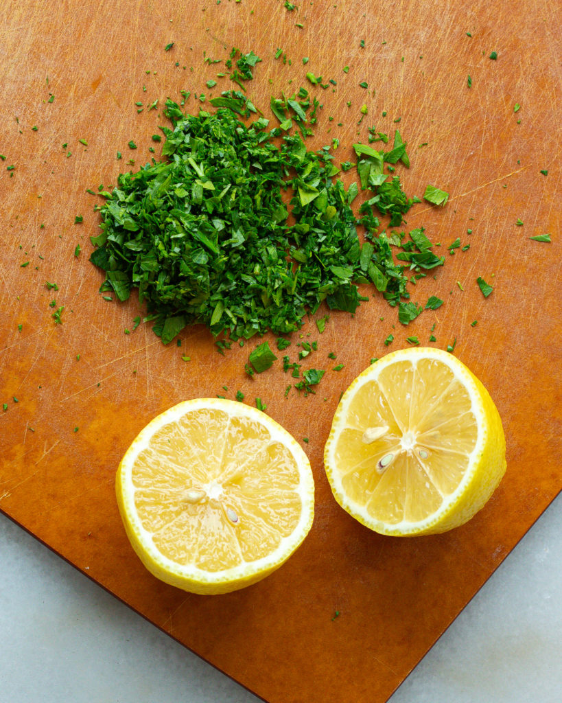 - Whisk together the tahini, honey, lemon juice and parsley. Season to taste and set aside.