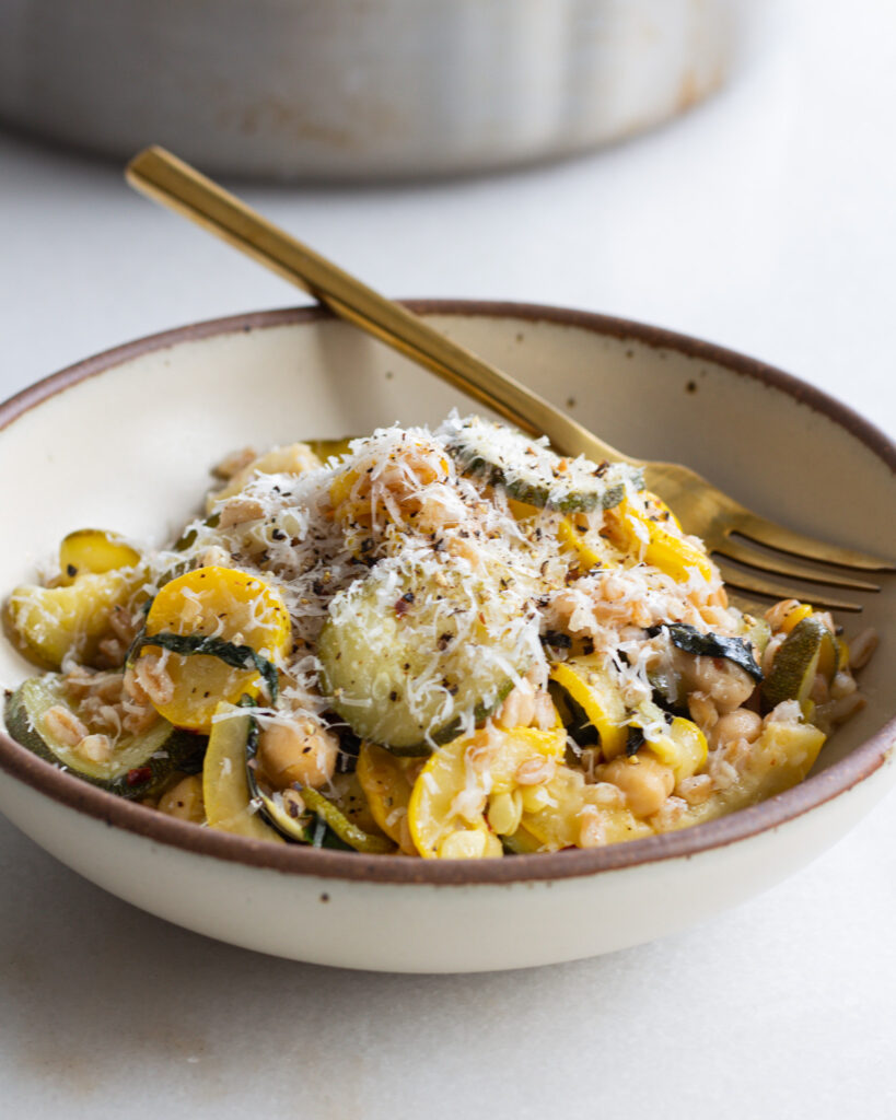 Ok so yes, a lot of caveats to this lemon zucchini farro bowl – yes, we are cooking down the whole lemon (it’s delicious), and yes, we are using zucchini and summer squash (but aren’t they one in the same?) and YES – I call this a vegetable bowl when zucchini is technically a fruit. SUE ME. BUT ALSO, PLEASE DON’T.