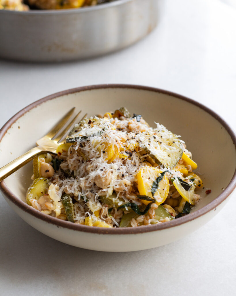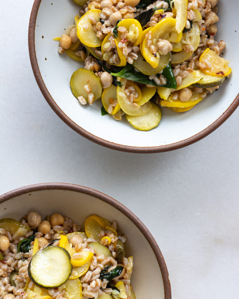 This lemon zucchini farro bowl uses a whole lemon. And you heard that right. It’s for good reason, too, a whole lemon is kind of like an onion. It has a really sharp and strong taste when it’s raw, but when you cook it down, it turns into something soft, mellow, and an absolute flavor bomb. People eat lemon rinds raw all the time (I’m not going to get into it….there are many opinions!) but I find it’s a much easier sell to convince people to eat lemons cooked. And in this lemon zucchini farro bowl, you might not even notice them! They blend in quite well with the summer squash, delivering only on flavor.