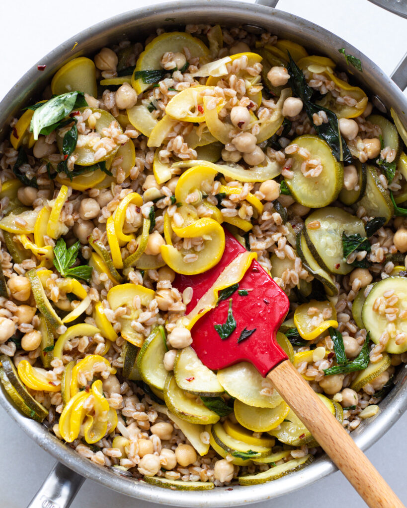 What you do get with this recipe needs no caveats – it’s an easy, wholesome, full meal that is built with great flavor and super-simple ingredients. I know I always say my recipes are simple (they are!) but this one is one of my go-to dinners because of how quick and easy it is. Your grains will cook the same time as your vegetables, so everything will finish around the same time. Lemons add a burst of brightness, while salt and chili flakes temper them out. Zucchini are the main vegetable, cooking down into their perfectly comforting texture and absorbing all the good flavor in the dish. Mint and basil are nearly crucial to add some freshness, and then you’re left with a really filling, really easy dinner. And if you’re a parmesan cheese head (which I am), feel free to add some to this. You can add at the end as a topping, or when you add the grains to really amp up the melt-factor.