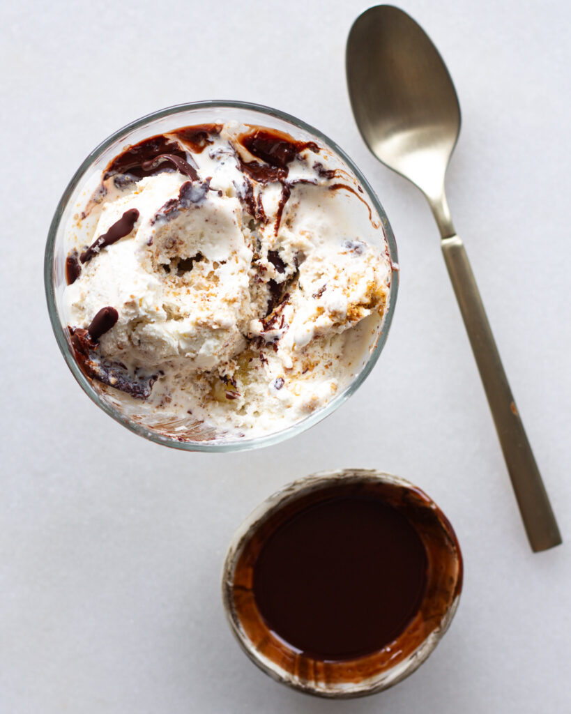 I first got hooked on this idea after going to Caffe Panna – this absolutely amazing gelato spot in New York City. There you can get one free “drizzle” and topping on a scoop, an I always get the olive oil drizzle and flaky salt. Before you say it sounds weird, olive oil on ice cream is absolutely heavenly. It’s rich, it has an earthy, luxe flavor to it, and it automatically elevates any flavor of ice cream. I can’t get enough, and with an olive oil chocolate shell, it’s like you get the best of both worlds.