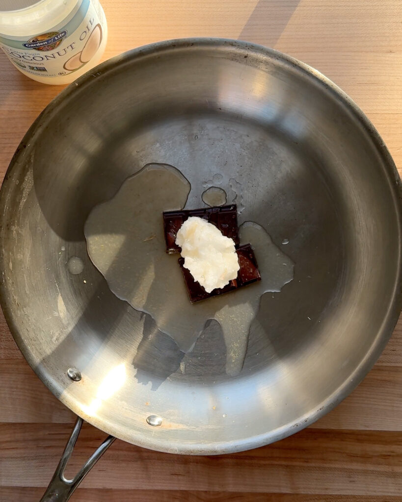 - In a small saucepan, add the chocolate, coconut oil and orange juice. Set this over medium-low heat and stir until melted.