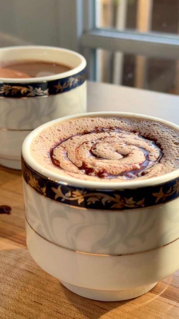 Make sure to swirl the sipping chocolate on top of the chai hot chocolate blend, like in the photo above. And serve warm!