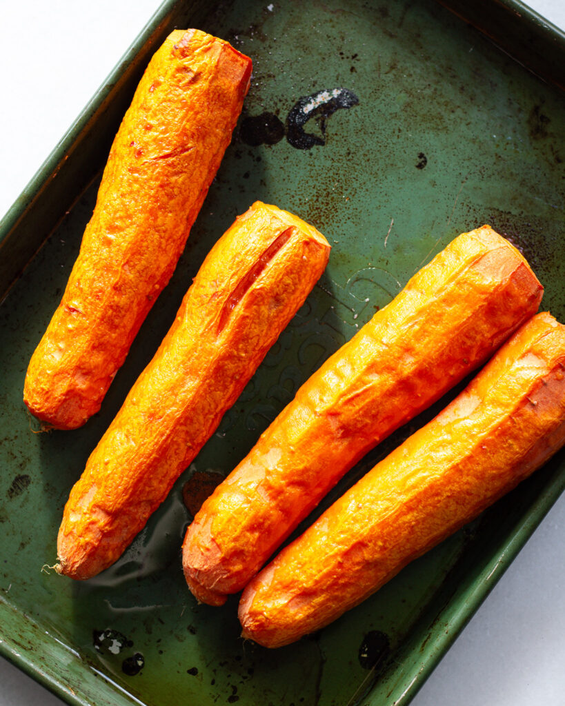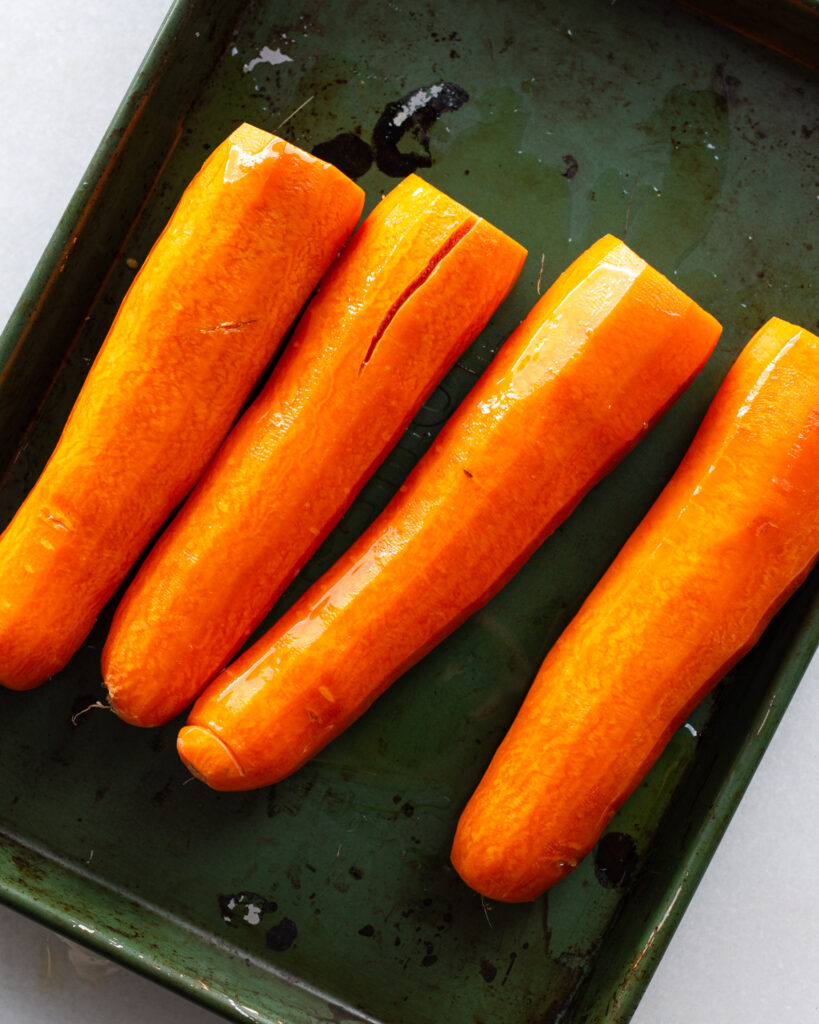 - While that is roasting, add the carrots to a sheet pan. Drizzle with just a bit of olive oil and toss to coat. Put this on the top rack of the oven and roast for 45-50 minutes, or until the carrots are very soft.