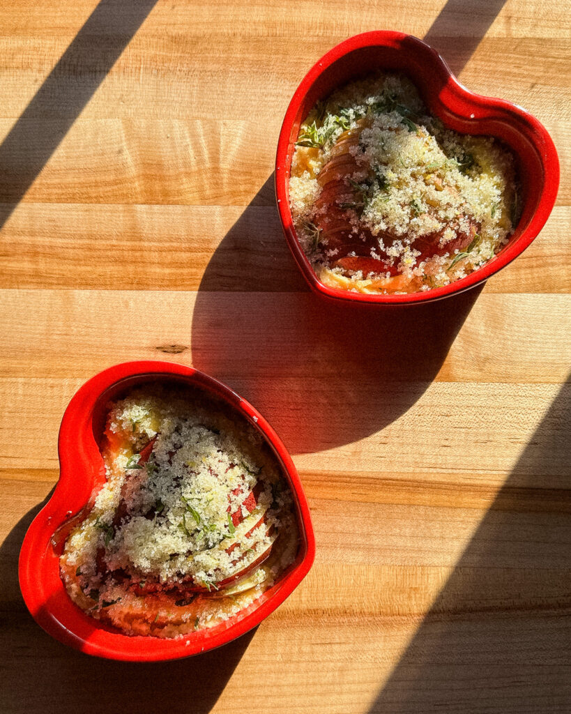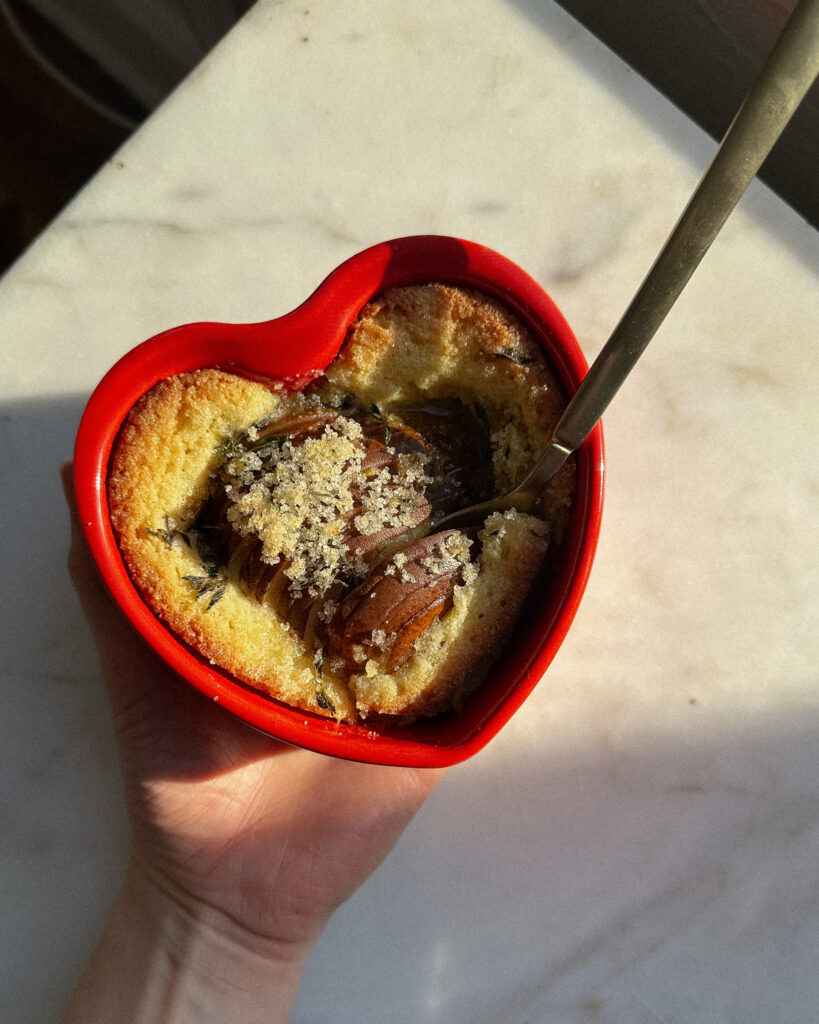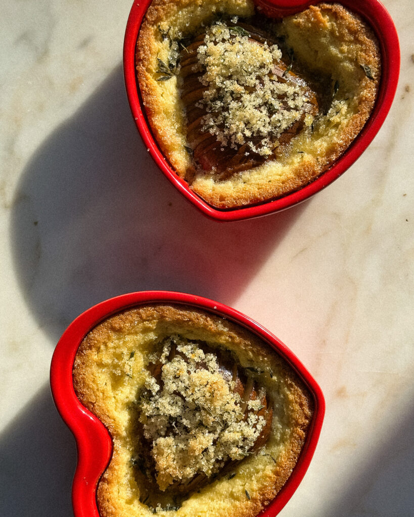 This recipe is a cute little Valentine’s Day recipe for when you are short on time but want something adorable, delicious and packed with flavor. Pears in Frangipane (or any fruit in frangipane!) is one of my favorite things to make, and eating straight baked frangipane is a surprisingly delightful experience. This Pears in Frangipane recipe balances the buttery richness of the French almond cream with a lemon thyme sugar. The sugar gets all toasted on top and the pears stay all jammy, making this the perfect sink-your-spoon-into-it dessert!