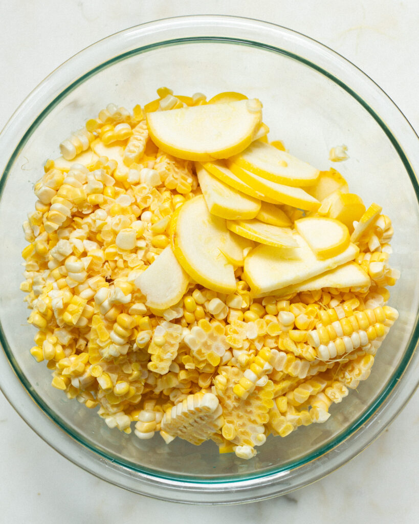 - Thinly slice the summer squash and add it to a large bowl. Cut the corn kernels from the ears of corn and set them in the same bowl.