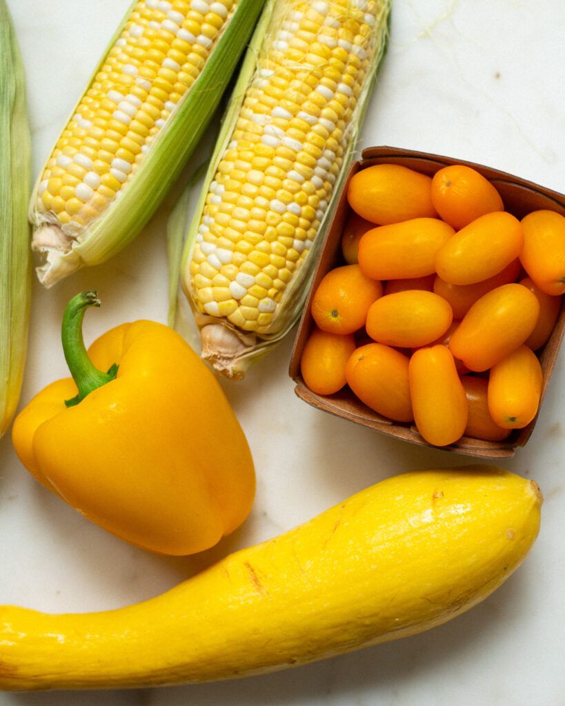 For the summer squash + corn – for the vegetables you cook, I suggest any other variation of zucchini as your substitute. You can also skip the corn altogether and sub it for edamame, if you like extra protein.