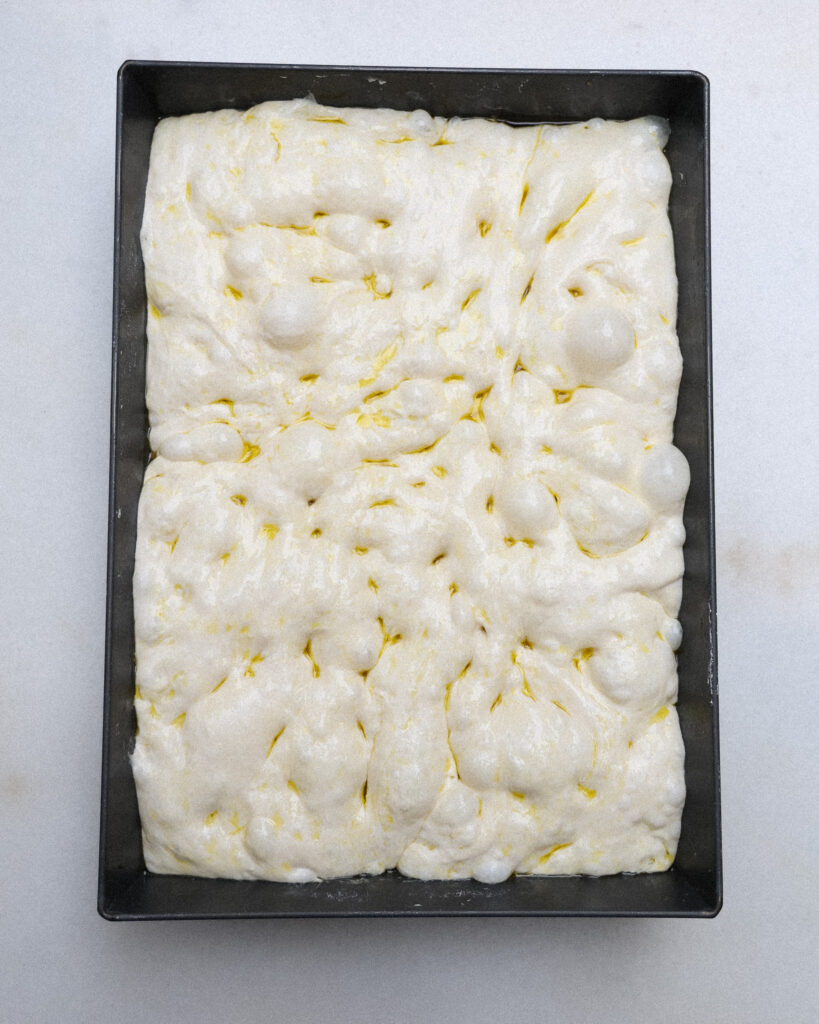 - Gently scoop the dough out of the pan and set it to the side. Coat the pan in 1/2 cup of olive oil. Add the dough back in, then "stitch" it up the center like you would a sourdough (see Note**). Cover and let the dough proof another hour and a half, or until it has fully relaxed to the edges of the pan and is bubbly.