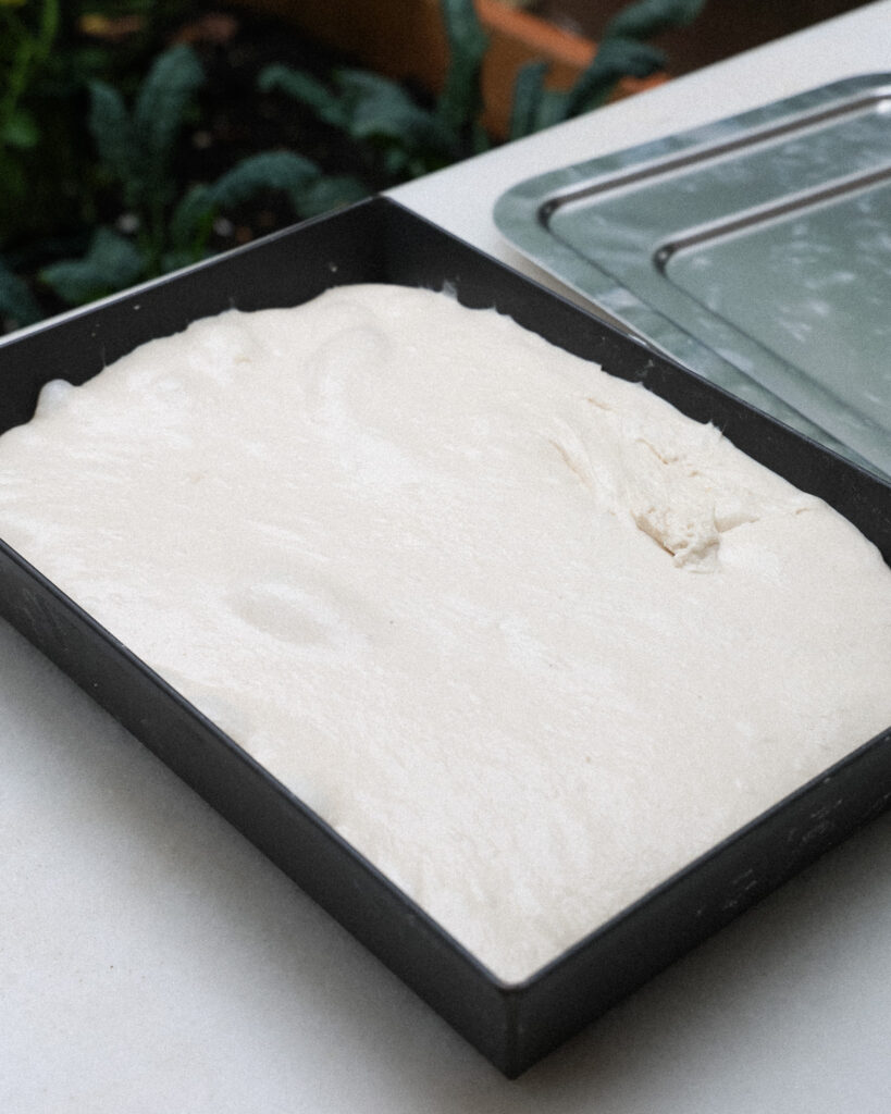 - The next day, remove the dough from the fridge and let it come to room temperature, about 2 hours. It should have relaxed out to all sides of the pan and be very bubbly.