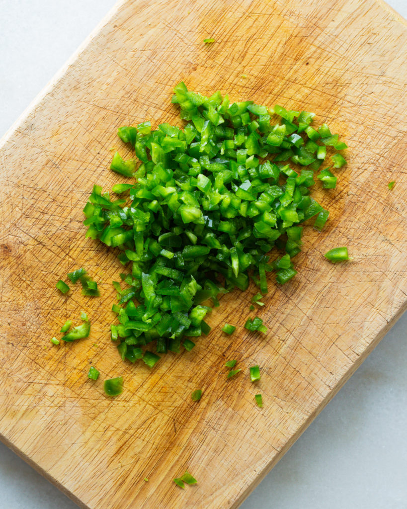 - Finely dice the jalapeños, removing the seeds. And slice the scallions thinly, stopping when the pieces are mostly white.