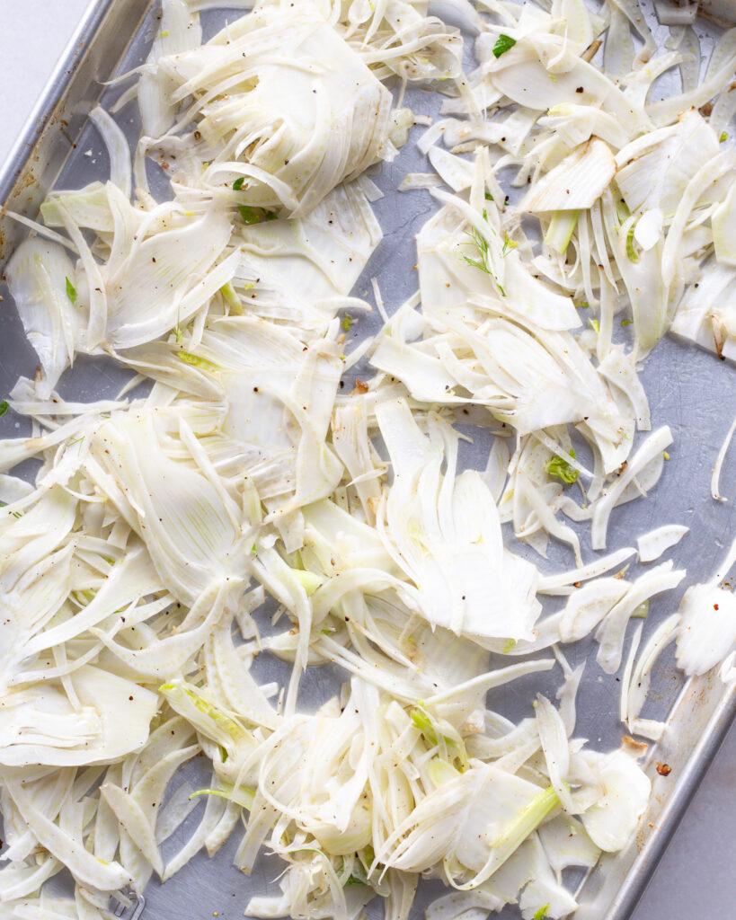 - Scatter the thinly sliced fennel on one baking sheet and the Brussels sprouts on another. Drizzle both with olive oil and season with salt and pepper.