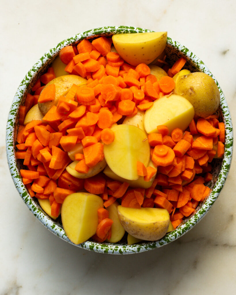 - Peel four carrots, halve them lengthwise and slice them into thin half-moon pieces. Quarter two pounds of baby potatoes and set aside.
