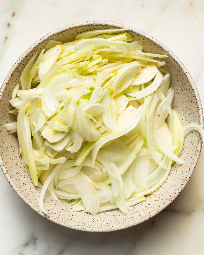 - Thinly slice the fennel bulb and onion. Set aside.