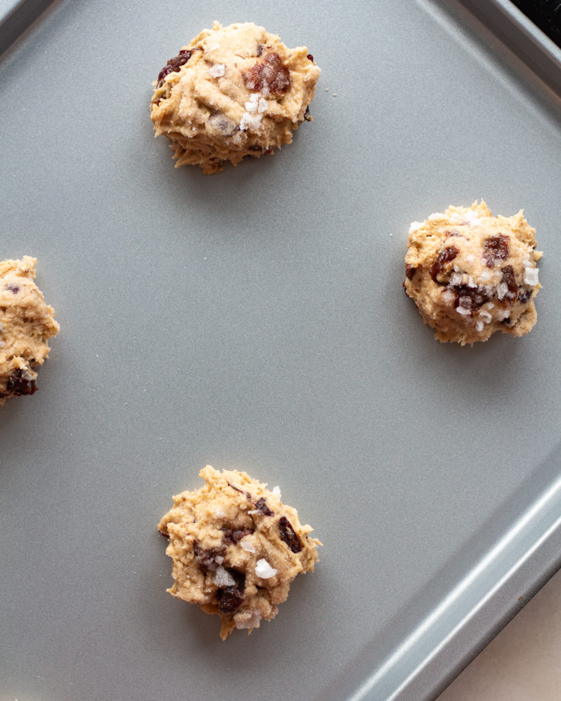 - Portion the cookies out into 8 equal balls, about 64 grams each. Sprinkle the top of each cookie with sugar and flakey salt.