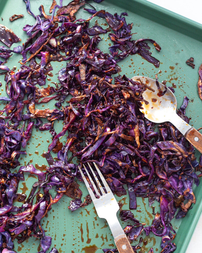- Thinly slice the red cabbage and add it to a large baking sheet, make sure it doesn’t overlap and crowd the pan. Use two pans if necessary. Drizzle with olive oil and toss. Roast at 425°F for 18-20 minutes, or until the edges of the cabbage are brown and crisp.