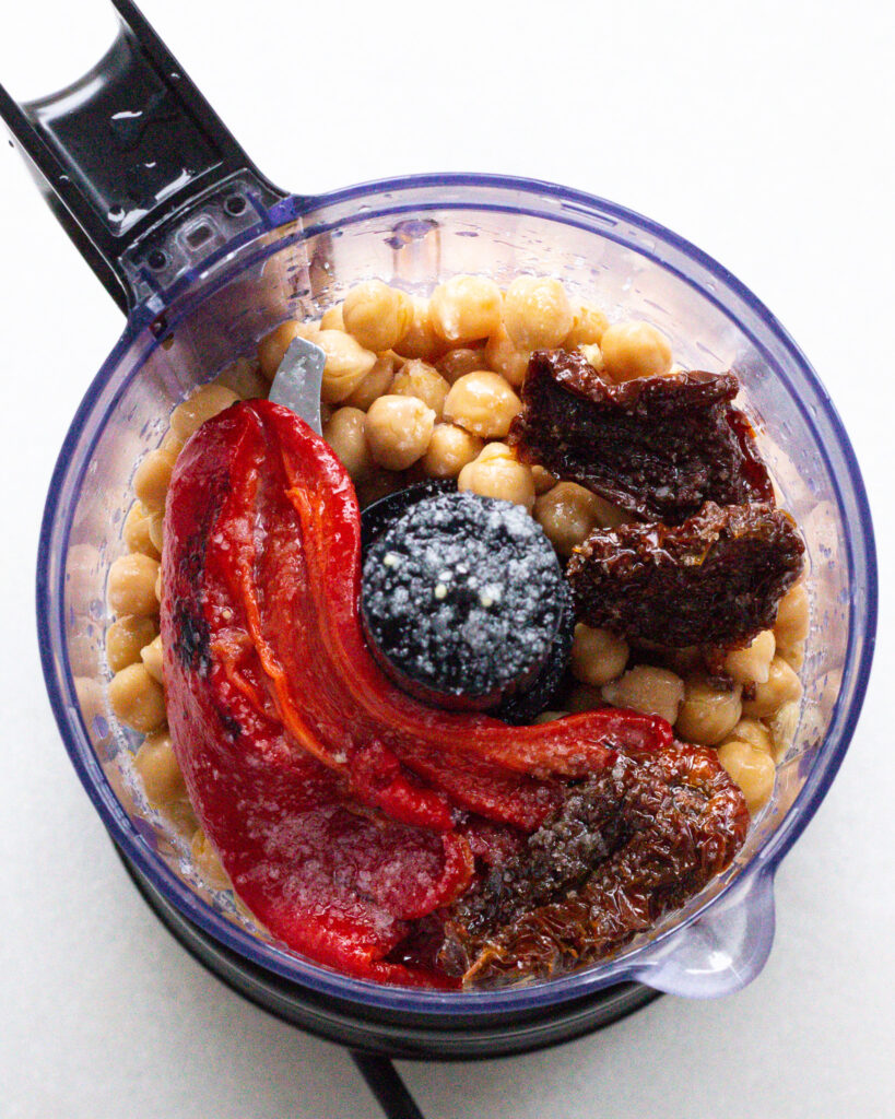 - Add the chickpeas, the roasted red peppers, the sun-dried tomatoes, salt, and the juice from 1/2 of a lemon to a food processor. Pulse until almost smooth, but still a bit textured. Set aside.